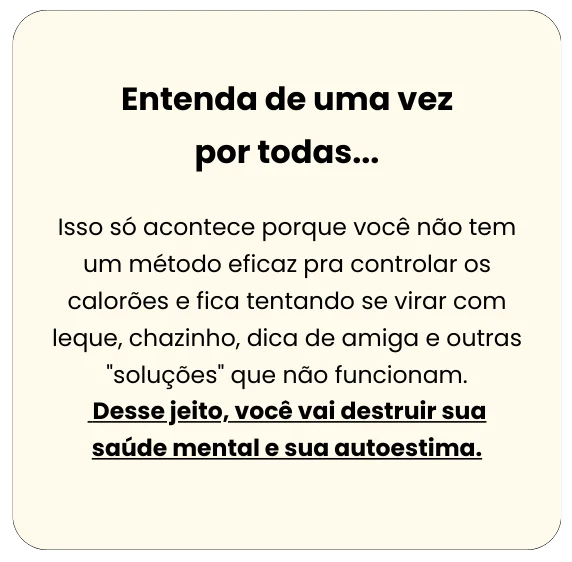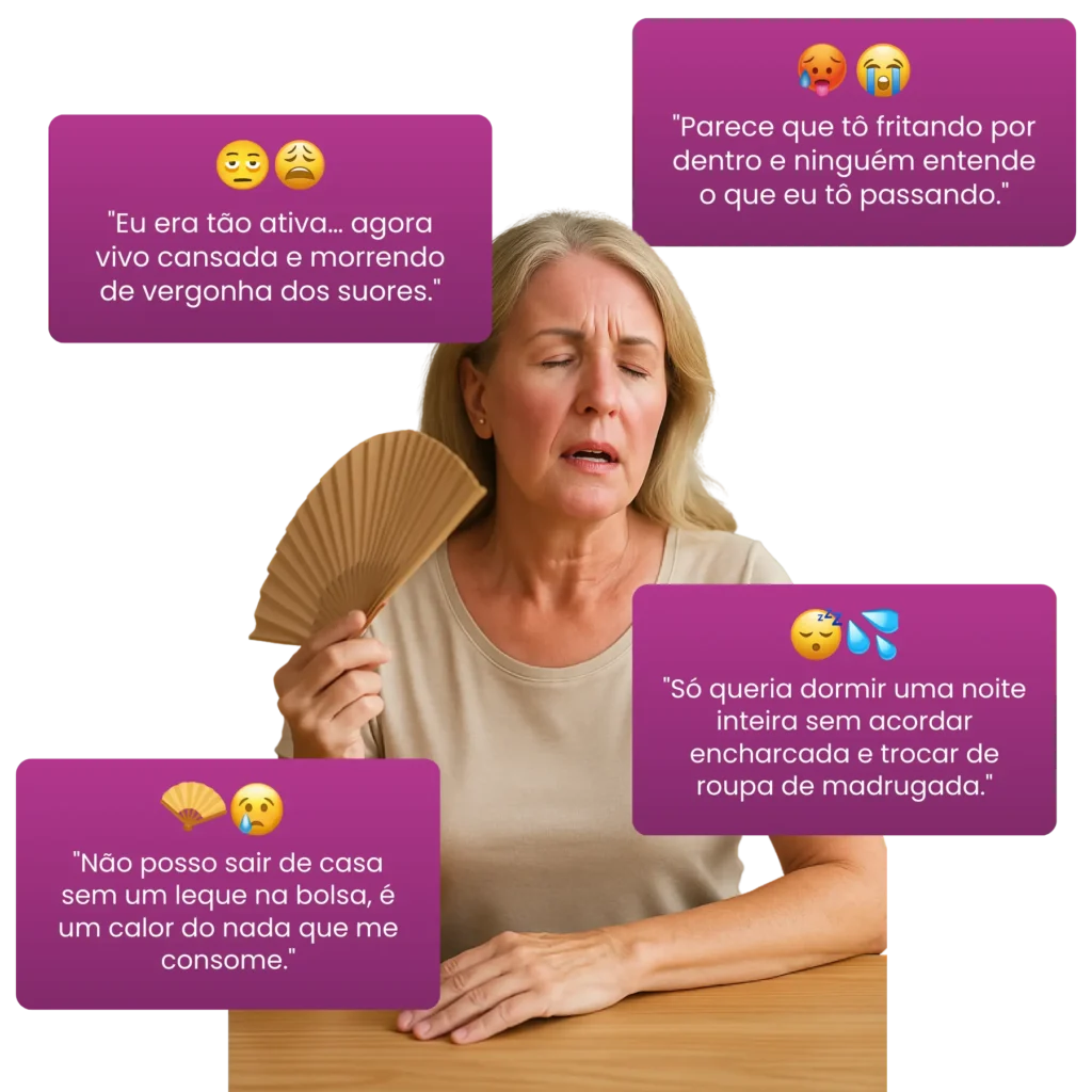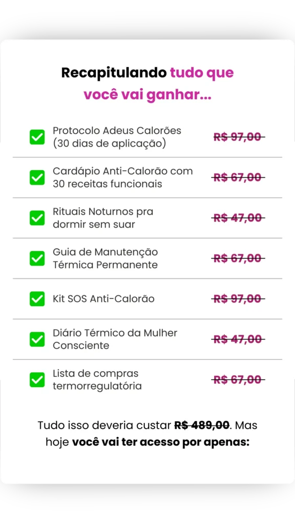 Com rotinas, receitas, técnicas e rituais que atuam direto no seu sistema de regulação térmica — sem hormônios, sem sofrimento, sem enrolação.